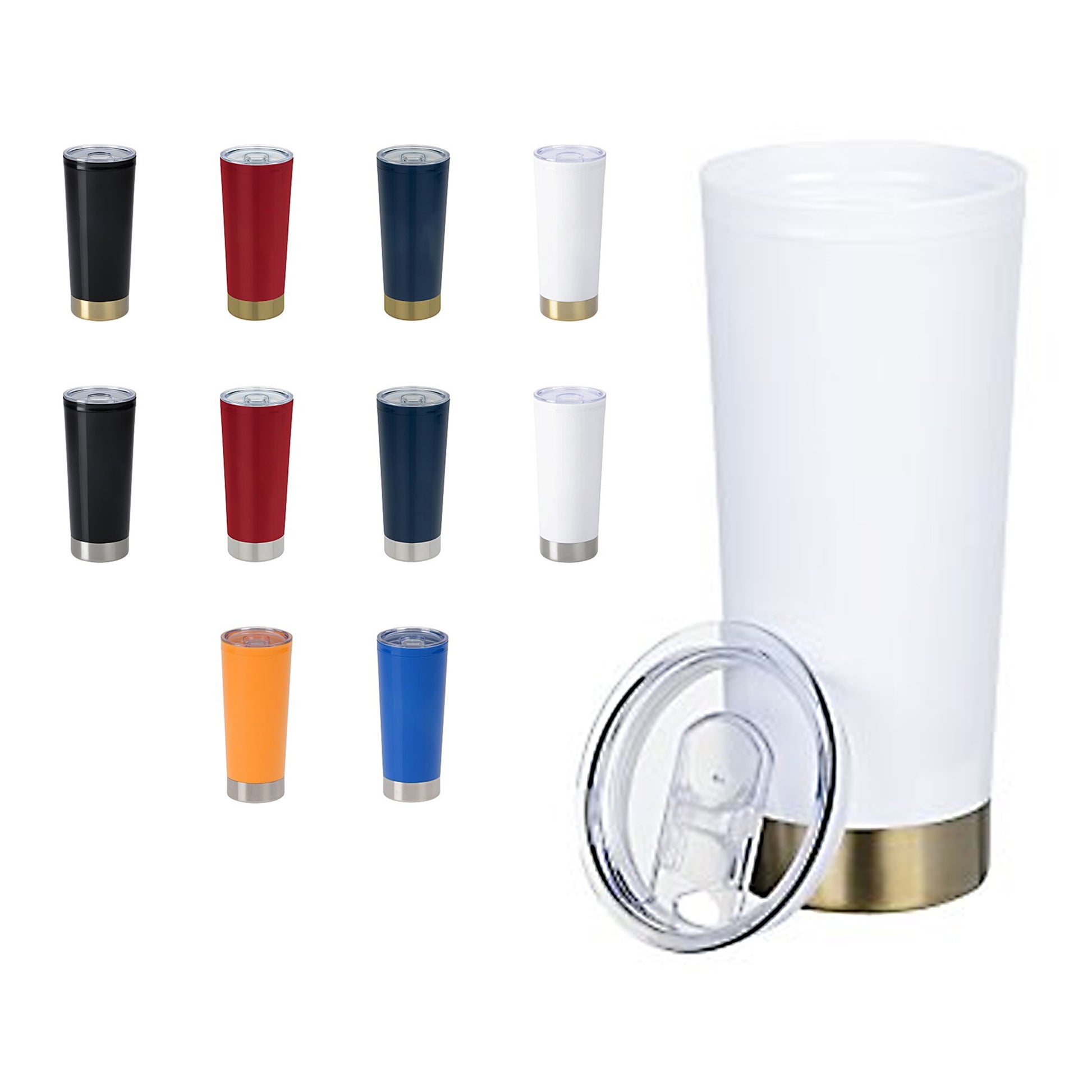 This to-go tumbler is made of double-wall acrylic with a stainless steel accent base. Dual wall design can be used with hot or cold beverages and has a push-on lid with a thumb -slide closure.
